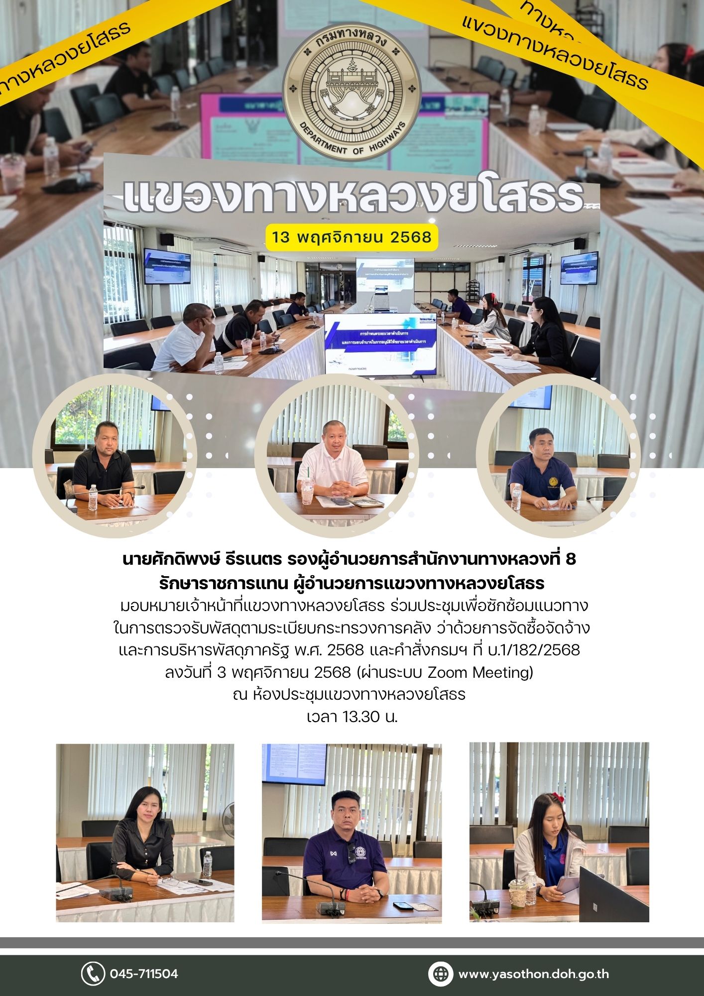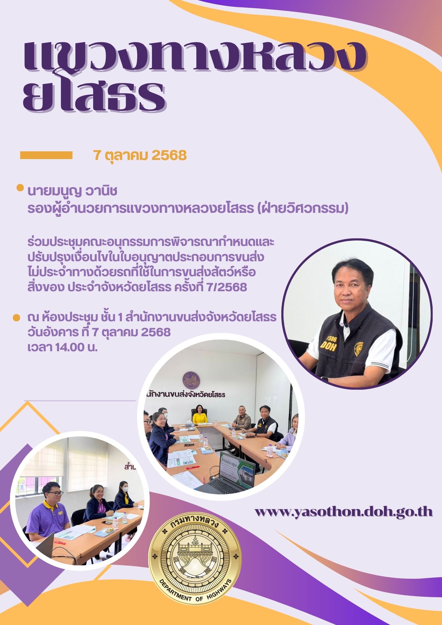 31 14/11/2568 ร่วมประชุมคณะอนุกรรมการพิจารณากำหนด และปรับปรุงเงื่อนไขในใบอนุญาตประกอบการขนส่งไม่ประจำทาง ด้วยรถที่ใช้ในการขนส่งสัตว์หรือสิ่งของ ประจำจังหวัดยโสธร
