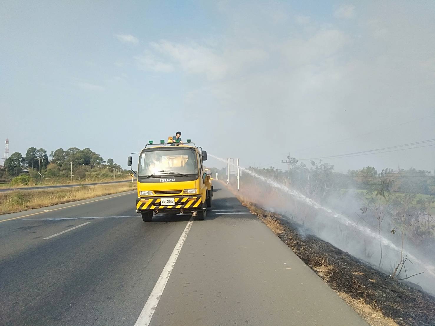 ตอน เสลภูมิ - ยโสธร ระหว่าง กม.152+500 - กม.153+000 โดยเจ้าหน้าที่และรถบรรทุกน้ำเข้าดำเนินการฉีดน้ำ เพื่อลดภาวะฝุ่นละออง PM 2.5